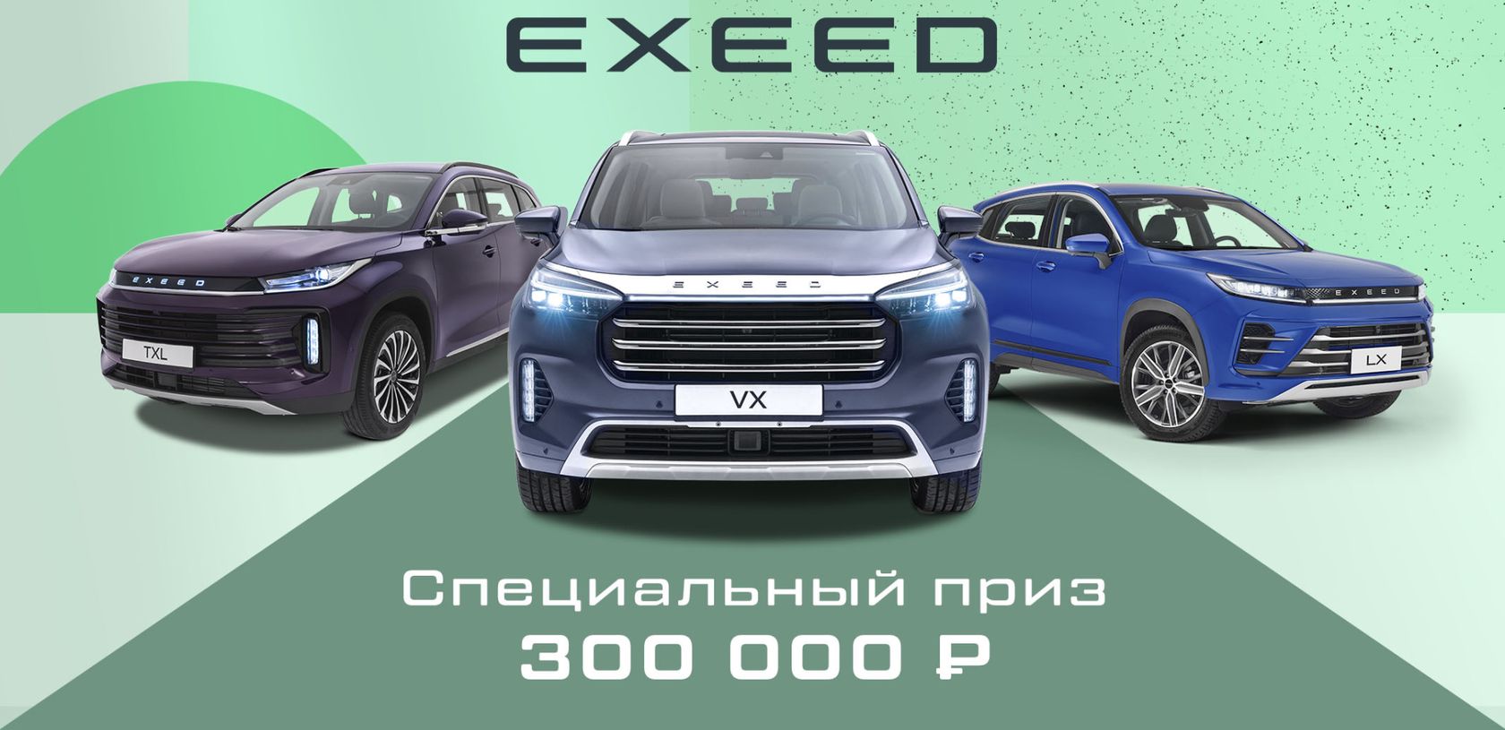 Протестируй один из новых автомобилей EXEED и участвуй в розыгрыше классных призов. А если ты влюбишься в автомобиль так, что захочешь купить его, у тебя будет шанс выиграть специальный денежный приз – 300.000 рублей!