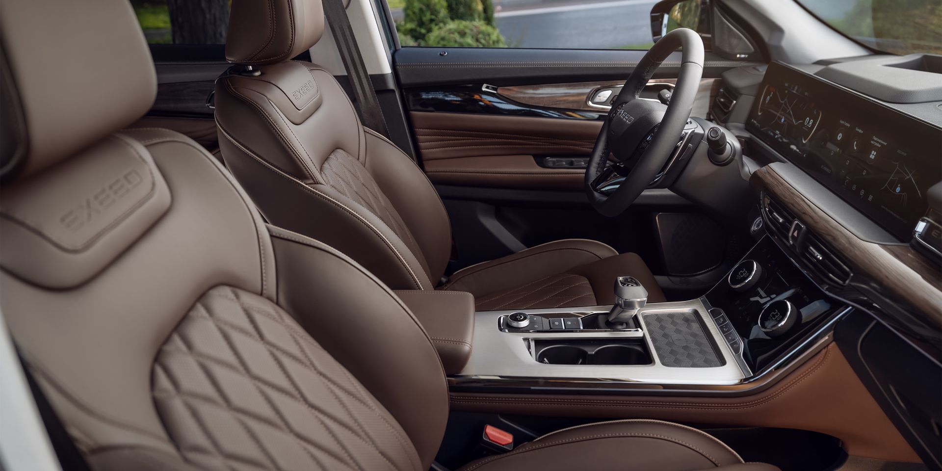 Салон внедорожника впервые отделан коричневой кожей с контрастной строчкой и кантом. EXEED VX Limited Edition также доступен в цветах кузова «Титан» (темно-серый) и «Сагиттариус» (черный).